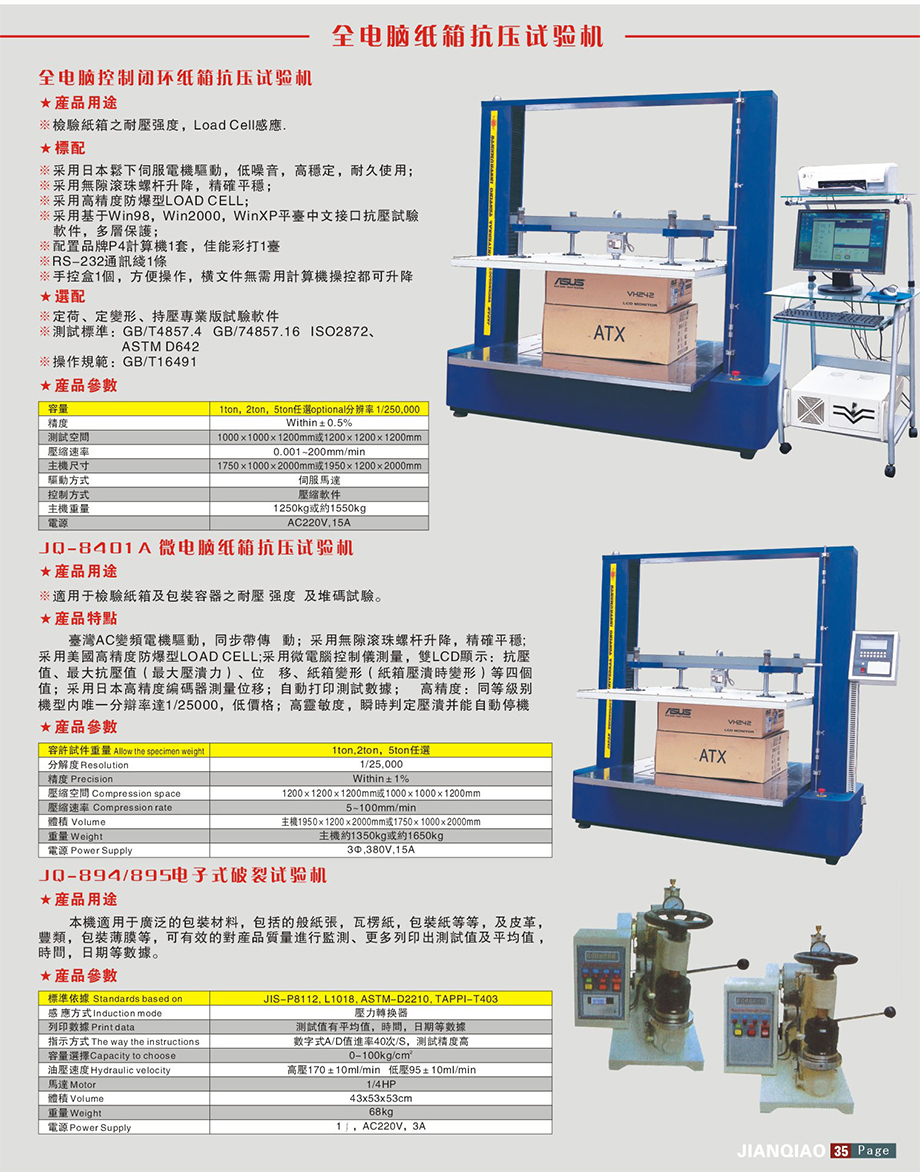 產(chǎn)品型號(hào):JQ-8401 品牌:劍 喬 用途:全智能電腦控制紙箱耐壓測(cè)試儀/整箱抗壓試驗(yàn)機(jī)/空箱抗壓強(qiáng)度測(cè)試儀是一款多功能標(biāo)準(zhǔn)型紙箱質(zhì)量檢驗(yàn)設(shè)備,主要用于各類中等常規(guī)尺寸瓦楞紙箱的抗壓強(qiáng)度試驗(yàn)或其他材料制成的抗壓強(qiáng)度小
