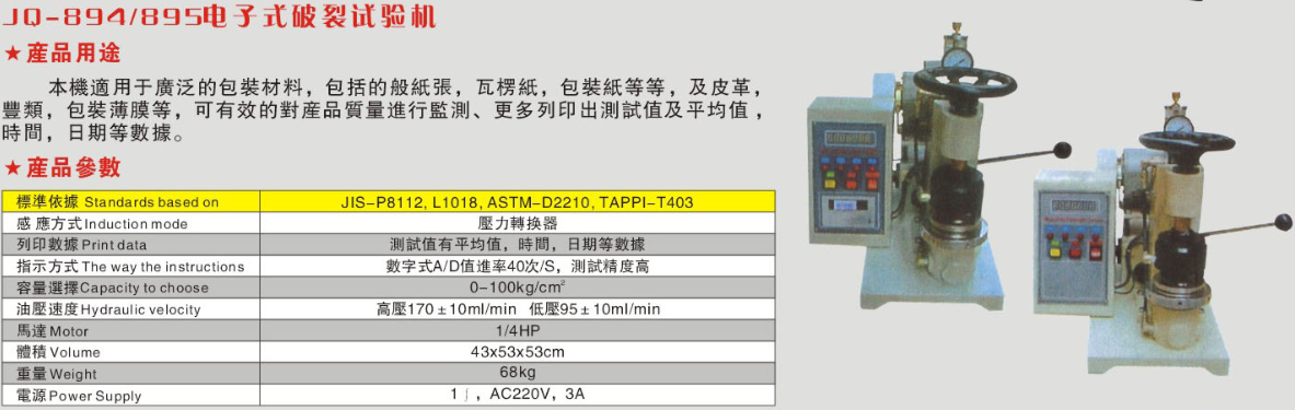 本儀器之設(shè)計符合ISO2759《紙板耐破度的測定》和GB/T1539《紙板的測定法》之標(biāo)準(zhǔn)要求。適用于以瓦楞紙包裝之制鞋、電子、電線、電器、五金、自行車、手提包、食品、家具等工廠,檢驗紙箱之抗破裂強度。亦可測試成皮﹑布類。采用訊號傳輸壓力,試料破裂時自動保留最大破裂強度值。