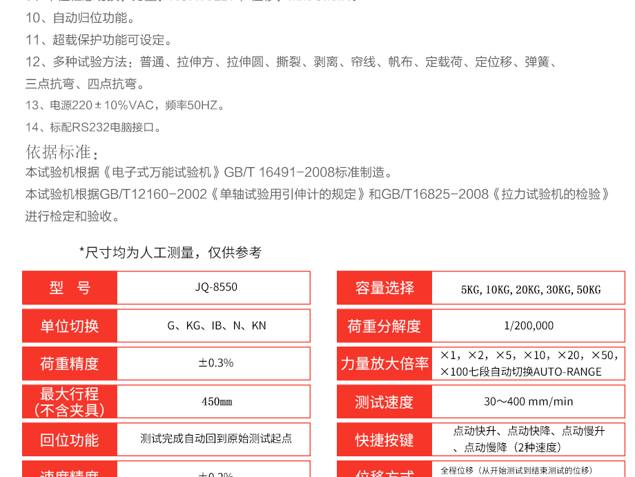 產(chǎn)品型號(hào):JQ-8550 品牌:劍 喬 用途:本系列機(jī)廣泛用于各類薄膜、五金、橡膠料、紡織、建材、絕緣體、電線、電纜、端子等各類材料。測(cè)試其拉伸、撕裂、穿刺、剝離、抗壓、彎曲、抗剪切、定荷重、定位移、三點(diǎn)抗折