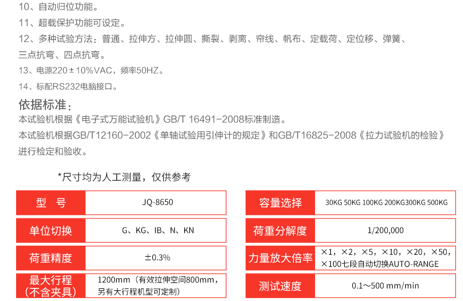 產(chǎn)品型號:JQ-8650 品牌:劍 喬 用途:本系列機(jī)廣泛用于各類五金、橡膠制品、鞋類、皮革、服裝、紡織、建材、絕緣體、電線、電纜、端子等各類材料。測試其拉伸、撕裂、剝離、抗壓、彎曲、抗剪切、定荷重、定位移、